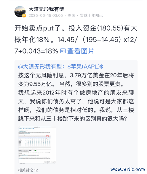 北京时间6月16日,段永平在雪球发文称:“开始卖点put了。投入资金(180.55)有大概年化18%。14.45/(195-14.45) x12/7+0.043=18%。”从晒出的截图看,段永平该笔交易的金额是144万美元。
